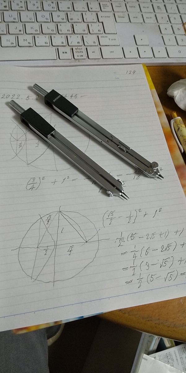 私「一応、これで、正五角形を描けるけど、ほんの少し誤差がある、というようなことは、聞いた。今計算しているところが、写真のコンパスの下に書かれているが、何が誤差なのか、ちょっと、分からない」